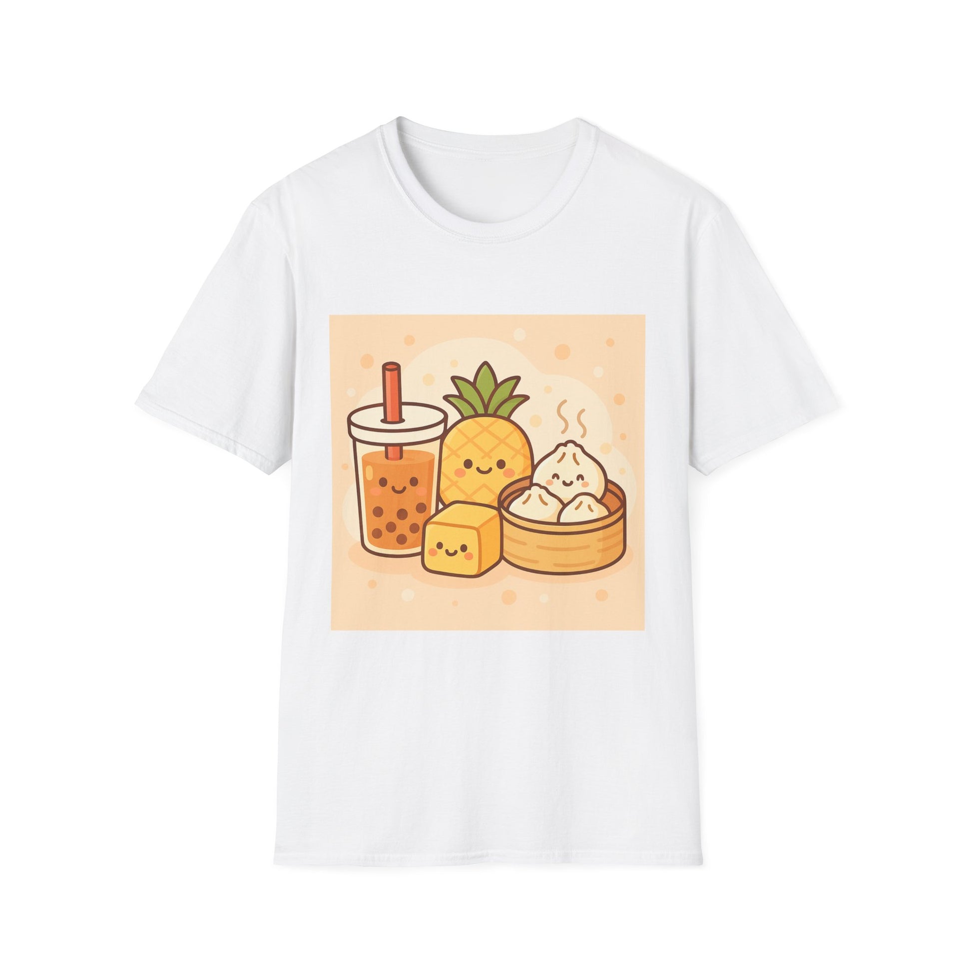 Brighten your wardrobe with this delightful unisex softstyle t-shirt featuring adorable kawaii Taiwanese food icons like bubble tea, pineapple cake and sweet dumplings. Crafted from soft ring-spun cotton, this shirt is comfortable for everyday wear. Perfect for food lovers and anyone who enjoys a playful vibe. Great for picnics, casual outings, or as a unique gift to showcase love for Taiwan's culinary culture.